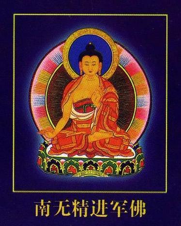 南方具德世界之精进军佛,身黄色,右手作施无畏印,左手当胸作合掌状,掌心向外,拇指略离食指。顶礼此佛可消除语门所造之罪障。