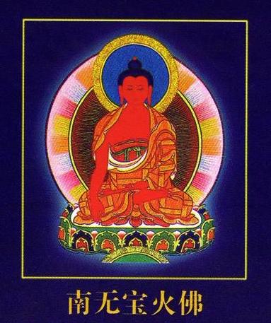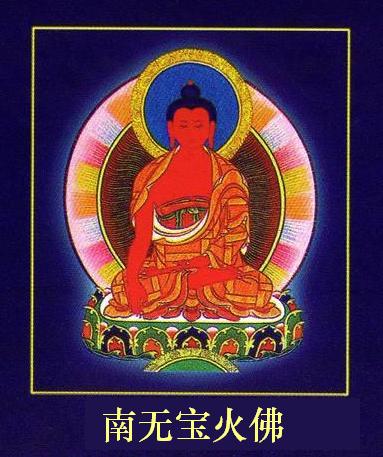 西方光明俱世界之宝火佛,身红色,右手按地,左结定印。顶礼此佛可消除劫夺僧财之罪障。