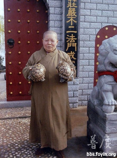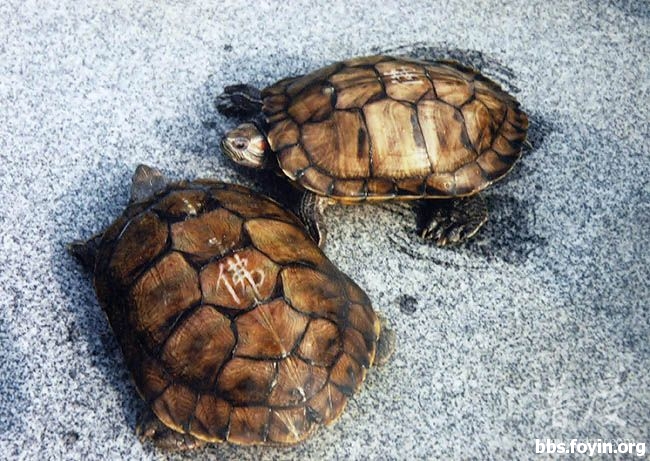师父就接过乌龟,把乌龟带到寺庙,快到十五了,要把两只乌龟给放生,师父心里就说:“我是受人之托,我要帮你们做个记号。”