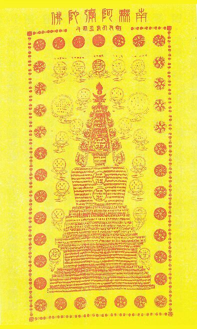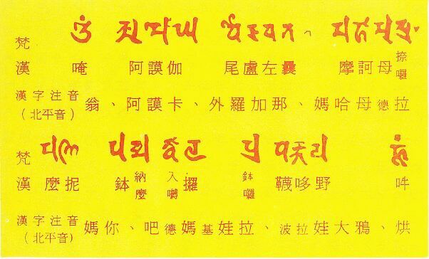 毗卢遮那佛大灌顶光真言:出自《大藏经》之密教部,此系梵文,意即“决定往生净土”。此咒之殊胜功德,可由下文得知: