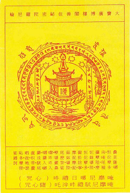 大宝广博楼阁善住秘密陀罗尼轮:出自《大藏经》。功用甚大,举凡家中闹鬼、幼儿多病、屋内阴气重、生意不顺、业障深重等,只须将此张咒轮贴于门上,每日由门下通过,即有无量功德。读者可于附图得见,莲花上有一宝塔,临终时置于胸前,其方向为塔尖向上。此宝塔能令一切恶业皆得消灭,决定当得无上正觉,能于现世获福无量,一切善根皆得圆满,一切魔军皆得调伏,一切众生见者欢喜,有无边功德。