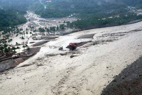 台军10日派遣直升机驰援甲仙乡小林村,从机上俯瞰灾区满目疮痍,滚滚洪流相当慑人。