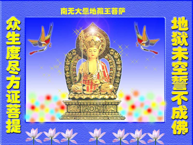 这三种咒一念完,我就跟地藏菩萨说:“地藏菩萨,我的事情做完了,接下来是你的事了,你一定要超度我母亲,一天不超度,我就跪在地上一天不起来,两天不超度,我就跪两天不起来,七天不超度,我就跪在地上七天不起来,直到我母亲超度升天为止。我要兑现,我不要在梦境中看到,我一定要亲眼看到才行。”说完,我就跪在那里念“南无地藏王菩萨!南无地藏王菩萨!”眼泪直流,边哭边念。不知道念了多久,我发觉地藏菩萨座下的水泥地上,升起一道清烟,起初还只是像香烟一般大,“咦!有烟,莫非是有感应了?”我心里这么想着,于是更加速的念:“地藏菩萨,地藏菩萨……”,那道清烟慢慢地往上升,冲破了底层的水泥屋顶,开了一个洞,一层一层的直升上去。经过第二层、第三层还是一样没有变化,到了第四层,这道烟就化成了莲华形状,到了第五层,莲华上面坐著一个人,竟然是母亲在家时候老太太的样子,到了第六层,母亲已经变成天人的模样了,到了第七层,更庄严了,宛如民间在拜的妈祖娘娘了,有凤冠霞披,手上拿了一个玉圭。转眼之间,莲花座已经升到塔尖了,在那儿打转。于是我向地藏菩萨祈求:“地藏菩萨,快!快!快!快给我消息,印证莲花座上那个人是我母亲。”刚说完,咦!莲花座上那个人忽然回过头来,喊了一声:“元哪!”(我的俗名)“妈!”我立即回答。她笑笑,欣然化为一道清烟,上升云霄,终于消失天际。我回过头来望著地藏菩萨的法相,感激涕零地说:“地藏菩萨,谢谢您,将我的母亲超度升天了。”