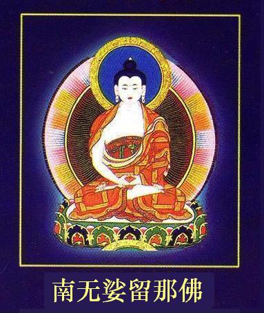 南方无垢世界之娑留那佛,身白色,结定印。顶礼此佛可消除毁辱罗汉尼之罪障。