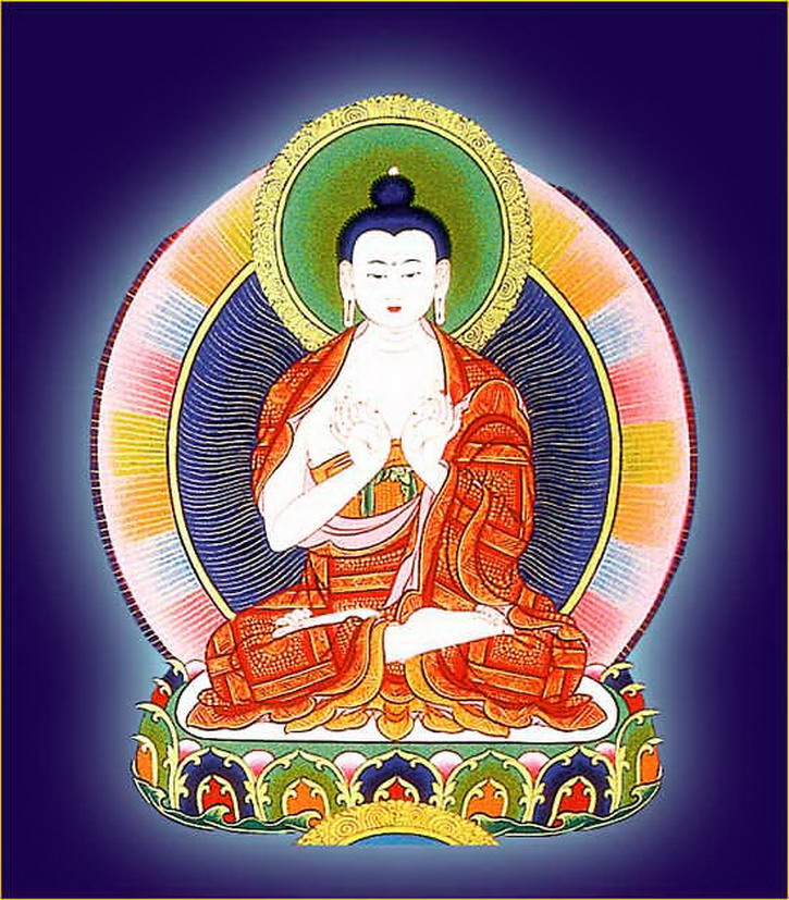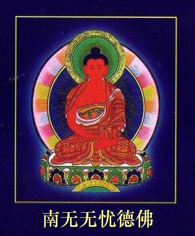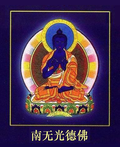 东北方不空义世界之光德佛,身蓝色,结说法印,顶礼此佛可消除以嗔恚所起之罪障。