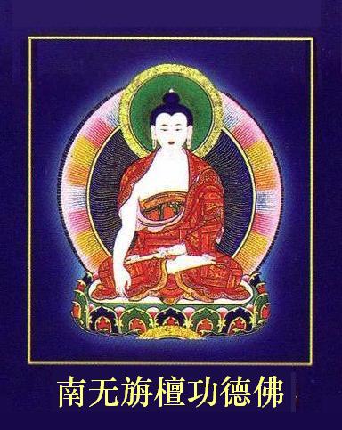 西北方遍妙香世界之旃檀功德佛,身白色,右手按地,左手定印。顶礼此佛可消除劫夺僧团食物之罪障。