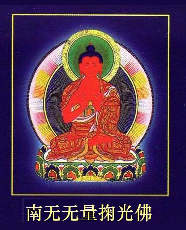 北方威德俱世界之无量掬光佛,身红色,结说法印。顶礼此佛可消除破坏佛塔之罪障。