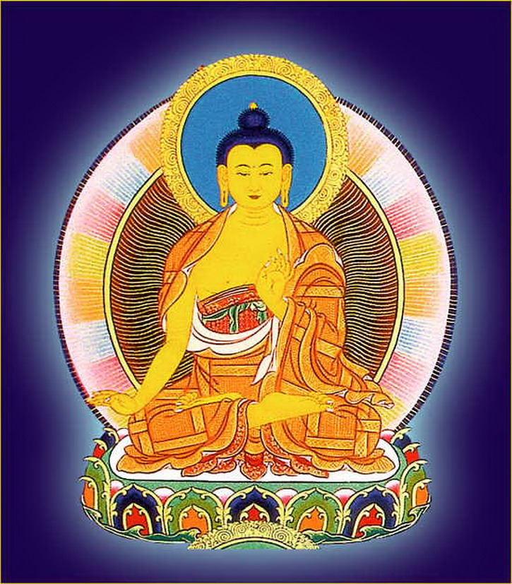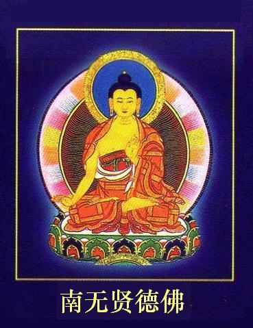 西方极乐世界之贤德佛,身黄色,右手作施无畏印,左手当胸作合掌状,掌心向外,拇指略离食指。顶礼此佛可消除杀圣者及阿阇黎之罪障。