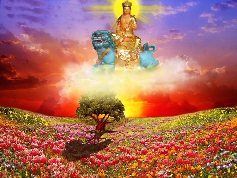 文殊摩诃萨,智慧通圆融;示现威德身,护持梵天真; 请尊挥慧剑,斩尽吾愚昧;众生断恶业,芸芸皆皈依。 顶礼文殊菩萨摩诃萨! 文殊大士,妙应无方,座前狮子兽中王,妙意降吉祥; 花雨天香,宝智透心光; 具大慈心妙吉祥,三世觉母智难量; 右持利剑烦恼断,左执青莲德相彰; 孔雀神狮供乘驭,毒龙猛兽伏清凉; 童形五髻知权现,本是如来欢喜藏。 南谟五台金色世界大智文殊师利菩萨! 南谟妙吉祥菩萨 ! |
