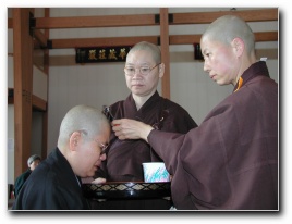 和尚开示云:「你能发广大心,剔发出家,应上求佛道,下化众生,愿佛法甘露流入你的心田,洗涤烦恼污垢,脱离尘劳;当念四重恩,精进修习;割爱辞亲, 方为你剔发及受沙弥尼戒。」