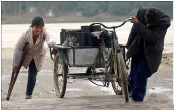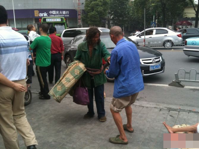 一名身着蓝色上衣的乞丐和一个穿着绿色上衣的拾荒者正在拿着钱推让。图为蓝衣服的,就是那个乞讨的,坚持不要,两人僵持了好一会儿。拾荒者知道生存不易,乞讨者以为拾荒者生存更不易,这种互相体谅令人体味得到何谓心存关怀和大爱。