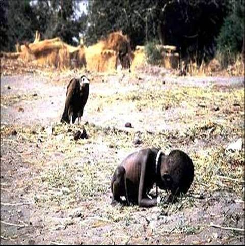 南非摄影记者凯文 卡特来到战乱的苏丹拍摄饥民的情况,走进灌木丛,他看到一个小女孩艰难地向食品发放中心爬来。他蹲下准备拍照时,一只大秃鹫落在女孩背后。卡特等了20分钟,那只秃鹫还不肯离开。秃鹫是专吃死人肉的。卡特拍完照,坐在一棵大树底下点起烟,叫着上帝的名字放声恸哭。<<饥饿的小女孩>>获1994年普利策摄影奖。两个月后,卡特自杀,他用一截软管将汽车废气导入车内。人们在汽车座位上找到他留下的一张纸条,上面写着:真的,真的对不起大家,生活的痛苦远远超出了欢乐的程度。