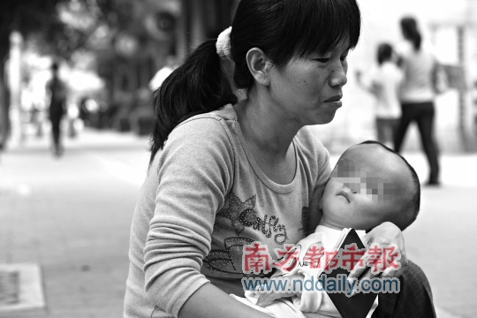 | 王敬香带着患脑积水的1岁儿子在环市路乞讨筹钱。南都记者 张志韬 摄 |