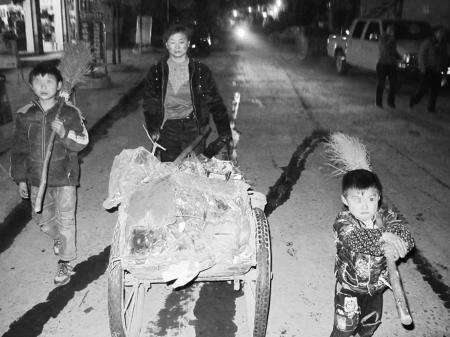 妈妈李芙蓉(涉及隐私,李芙蓉母子为化名)躬着腰正在将扫在一起的垃圾扫进推车里。借着路边商铺的灯光,娘仨将一堆堆垃圾收集拢来。妈妈推着小斗车,哥俩一左一右,将长长的扫把扛在肩上,都没什么话说。将一斗车的垃圾装上清运车后,娘仨回家了。