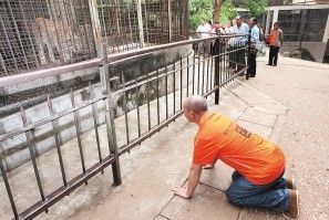 昨天上午10点,片山空来到昆明动物园,身上的橙色T恤背部印有“我替人类向动物谢罪,救护生命、保护生命、爱护众生”的字样,在观赏动物的游客中间,走到每一种动物的围栏前,口里说着“我替人类向你们真诚谢罪”,然后双手合十、双膝跪下、磕头,然后若无其事地走向另一个动物围栏,重复着相同的动作,任凭周围的市民侧目相看。