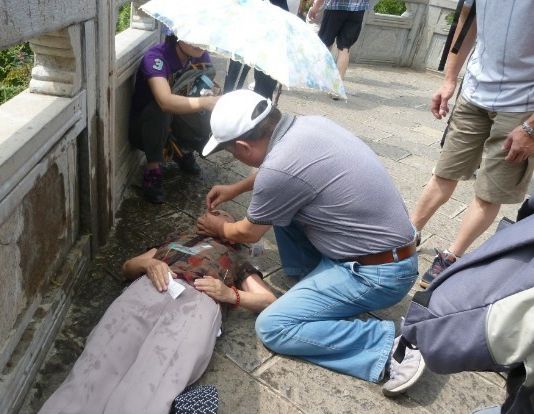 自己与朋友跑去一看,只见在观景台的地上躺着一位头发花白、体型消瘦的老太,当时,老太的脸色发白,嘴唇已呈青紫色,旁边的子女急得手足无措,只晓得往她身上洒水降温。