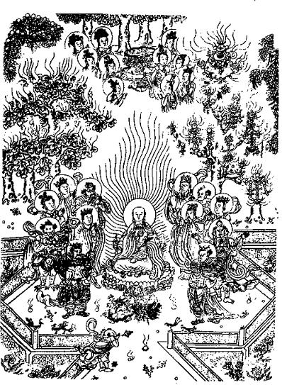 于是,善财童子立即往诣日光园,四周普遍的观察:园中有满月树、叶树、华树、果树、摩尼宝树、衣树、音乐树、香树等八种无漏林树,有的放出各色光明,有的发出美妙音声,有的放出妙香,……在这日光园中,又有水泉、河流、陂地,一切都以七宝庄严,池中盈满八功德水和金沙布底,还有无数青莲华、红莲华、黄莲华和白莲华遍覆在池面上。在这日光园中,又有无量宝树周遍成行(音háng),在这一切诸树下面,敷放着由种种妙宝庄严的十万宝师子座。在这日光园中,还有用鸟羽编织的地毯,布满园地。有无量诸鸟,出和雅音。又有无色百千多众宝庄严的楼阁。