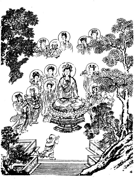 于是,善财童子向寂静音海主夜神顶礼叩拜,然后右绕无量匝,殷勤瞻仰她的尊容,目不暂舍,辞退而去,再拜访另一位(第三十六位)善知识。
