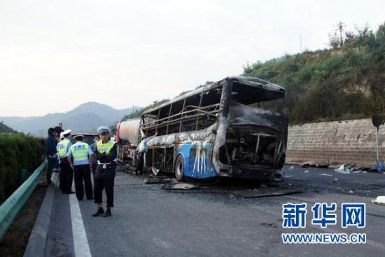 新华网延安8月26日电(记者石志勇) 8月26日凌晨,位于陕西省延安市安塞县境内的包茂高速安塞服务区附近发生一起特大交通事故,一辆满载旅客的双层卧铺客车与一辆运送甲醇的重型罐车发生追尾碰撞,随后燃起的大火导致客车上36人死亡,3人受伤。