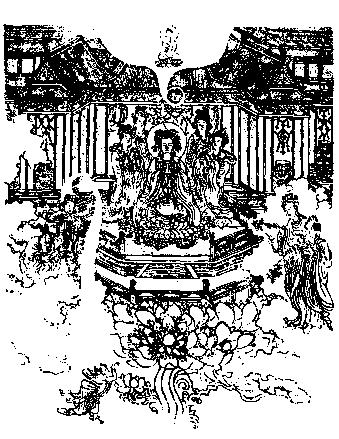 这时,即时看到大宝莲华从地涌出。这朵大宝莲华,非常清净,万分庄严。有无数无量的宝网,弥覆在这朵大宝莲华上。在华台之上,有一楼观,名叫普纳十方法界藏,在这楼观中,有如意宝莲华之座。善财童子见到摩耶夫人坐在这庄严的宝座上,入‘色身三昧’,在一切众生前,示现四十种清净色身⑦。这样的四十种色身,并不是由五蕴(色、受、想、行、识蕴)所成。虽有色相的存在,但象影像一样。……