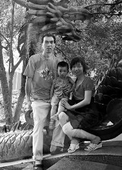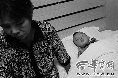 9月15日晚,两岁的占学发在武汉的宾馆里睡着了。右图为占学发和爸爸妈妈的合影,之后不到3个月,父母双双遇难,他瞬间变成了孤儿