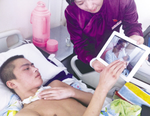 周学博试图用手触摸屏幕中的儿子 ■本报记者 张墨寒 摄 晨报讯(记者 张墨寒)听到妻子要打掉腹中孩子,车祸后昏迷不醒的丈夫眼角淌出了一滴泪…… 就是这滴泪,令22岁的何跃彻底从困境中坚强起来,她毅然决定为了爱,留下这个孩子。 所幸,何跃的丈夫周学博竟赶在孩子出世前渐渐开始恢复知觉。昨日,在孩子出世的第三天,两地医院通过视频连线,让这一家人“团聚”了。 一场车祸 毁了这个幸福的家 23岁的周学博和22岁的何跃原本有个幸福的家,因为跑运输,一家人在村里的生活条件算是不错的。5月9日,周学博和父亲从外地返回葫芦岛市建昌县的家时,在京港澳高速驻马店段发生车祸,周学博全身多处骨折,颅脑受损严重昏迷不醒,父亲也当场死亡。 经抢救,周学博一直昏迷不醒。何跃此时已怀孕近5个月,她挺着肚子和婆婆、爷爷一起照顾昏迷的丈夫,医院多次下了病危通知。但一家人没有放弃,将周学博接回离葫芦岛较近的锦州继续治疗。刚回来两天,周学博的爷爷突发脑出血,没等到孙子清醒就辞世了。 为筹医疗费 求遍全村 为给周学博治病,一家人花光了所有的积蓄,何跃也想做引产赶紧打工挣钱给丈夫治病。当她将这个想法告诉了护理的婆婆,谁知一旁昏迷的丈夫竟然流下了眼泪。 “这也许是心理感应。”何跃思想斗争了好几天,最终她决定为了爱也要把这个孩子生下来。 为了筹集医疗费,何跃的婆婆甚至回到老家向所有村民都求了个遍。 因家中已拿不出一分钱,快要生了的何跃只能回到在长春的父母身边,一有时间就打电话询问病情。丈夫终于能睁眼了,丈夫能听懂话点头了……这些转变都是她待产时的动力。 孩子出世 一家人只能通过视频“团聚” 准妈妈何跃的事,通过长春《新文化报》的报道很快被市民知道了,好心人的捐款达到了5万多元,而且当地一家妇产医院免费接收了何跃。9月18日下午,何跃在医院顺利的产下了6斤3两的男婴。 初为人母的何跃更担心的还是远在五百多公里外治病的丈夫,“他要是能看见孩子,肯定能给他带来动力。”为了圆她的这个梦,妇产医院特意购置了两台平板电脑,一台留在何跃和孩子身边,一台由熟悉何跃的医护人员带着来到了锦州。 昨日12点多,经过7个多小时的车程,从长春赶来的医护人员和媒体记者打开了视频连线,一家人通过这种特别的见面方式,终于“团聚”了。 视频中的何跃强忍着眼泪,不断地将孩子凑近屏幕。这边的周学博哇的一声就哭出来了,伸出勉强能抬起的手试图触摸着屏幕中的儿子。何跃的婆婆也一边摸着眼泪,劝说儿子的同时不断地探头看看未曾谋面的孙子。 通过在锦州几个月的治疗,周学博从昏迷不醒到能睁眼、能听懂话、能间断地说几句话……正在一步步地康复。主管医生说尽管周学博经过一次手术处理了双腿的股骨,但其他部位的多发骨折还需多次手术,臀部的溃烂也需要植皮。 可好心人捐赠的5万元钱,也早已花光。何跃的婆婆说,“人家生孩子都是一家人陪着,可儿媳妇我照看不了,孙子生了我买个奶粉的钱都没有。”