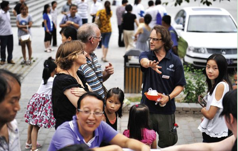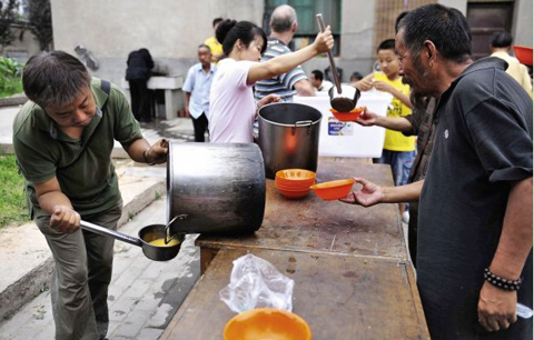 9月21日活动当晚,来了很多看热闹的人。不少市民得知身边有这样一位“洋雷锋”后,纷纷赶来一睹真容。第一次加入活动的志愿者达到前所未有的30名,加上定期来的老志愿者,食堂里人满为患。为了避免混乱,又能让新人体会助人的快乐,新志愿者排起长龙,包子和粥汤如击鼓传花般传递至流浪者手里。围观者太多可能让吃饭的人不好意思,毕竟是穷困潦倒来吃免费的包子。托尼向到场者要求,一定不要拍照。