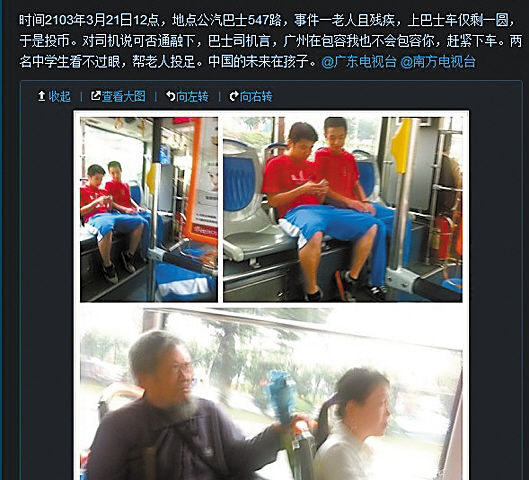 昨日中午,广州一残疾老人在搭乘547路公交车时,因身上只有一元钱投币而遭司机大声奚落、拒绝上车。正当老人窘迫之际,车上两名中学生为老人投币解围。