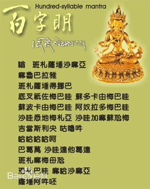《无垢忏悔续》中也说:“百字明是一切善逝的智慧精华,能够净除所失毁的戒律与分别念的罪障,堪称为一切忏悔之王。倘若一次性念诵一百零八遍,便可酬补一切所失之戒,不会堕入三恶趣。任何一位瑜伽行者如果能发誓念诵,不但此人今生会被三世诸佛视为胜妙长子而加以护佑,而且命终之后,也无疑会成为诸佛的长子。”