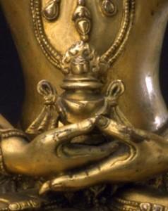 转法轮印:两手置于胸前,右掌与左掌相反,左右诸指轻触之相。