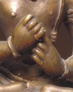 智拳印 以两手分别作金刚拳(以四指握拇指于掌中,称为金刚拳),再以右拳握左手食指于胸前,据说此印相表示消灭无明烦恼,能得佛智慧。