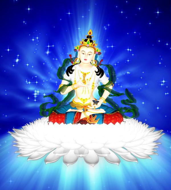 在我们头顶上的金刚萨埵,形象是金刚萨埵,本体是自己的根本上师。而且,他不是一尊的体性,而是百尊之主,是融寂猛百尊乃至浩瀚无垠所有圣尊于一体的智慧本尊。这位本尊,不是像唐卡或壁画上画的那样,扁扁的、不动摇,他是立体的。虽然是立体的,但他不具有实质性的内在,像铜铁或泥巴像一样,里面装着实物;也不是像人体一样具有血肉,而是如彩虹一般,显而无自性。这就是生起次第观想本尊的方法。