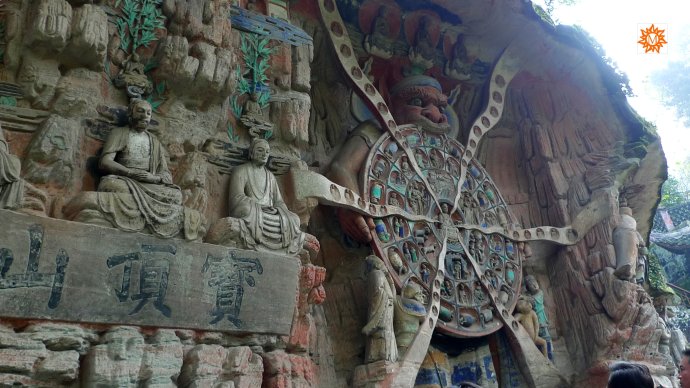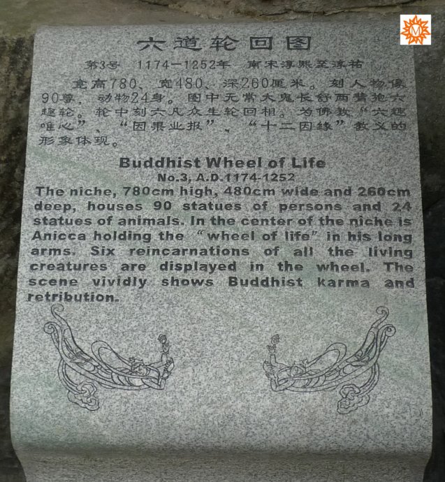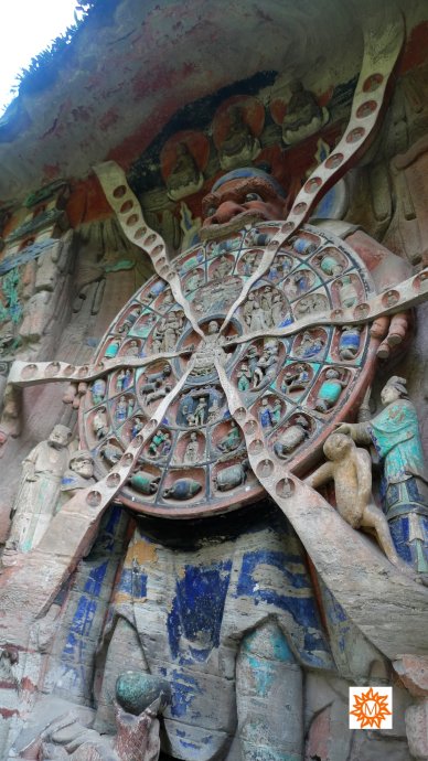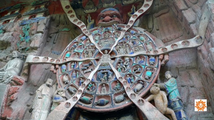 图中挺立无常大鬼(高5.20米),横眉怒目,据说因为大足石刻是密宗佛教的道场,而密宗佛教又很讲究威慑力,所以故作愤怒状,让人看了之后心感畏惧;另外因为看上去让人害怕能更好的震慑人心,使人们不敢做坏事。“无常大鬼”口衔、双手怀抱"六趣"轮盘(径2.70米), 这个轮子其实就是“苦海”的缩影。大轮总共分为四圈,第一圈中心坐了一个人,表示修行的众生,胸际放出六道光带,每一道上都有小圆圈,圆圈里刻的不是佛就是菩萨,这表示人都是有佛性的,在人的左边有一只小猪,表示贪婪;下边有条绿蛇,示嗔悔和表示狠毒;右面看上去象三角形的东西是一只鸽子,表示痴,佛教把“贪”“嗔”“痴”叫做“三毒”,由于受“三毒”的影响人的佛性就会受到掩盖,作的就是恶业,就会遭恶报;如果能排除三毒的影响那做的就是善业,那就一定会有善果了。