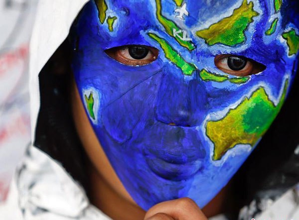 当地时间2014年3月17日,马来西亚吉隆坡国际机场,一名艺术家站在祈福留言板前,在模特脸上绘制地图,为航班祈福。