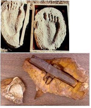 但一些零星发现的化石证据质疑了这种权威说法。在美国得克萨斯州Glen Rose的帕拉克西河(Paluxy)河床中发现有生活在白垩纪的恐龙的脚印,考古学家们吃惊地在恐龙脚印化石旁十八英寸半的地方,同时发现有十二具人的脚印化石,甚至有一个人的脚印迭盖在一个三趾恐龙脚印上。把化石从中间切开后,发现脚印下的截面有压缩的痕迹,这是仿制品无法做到的,显然不是假冒的。另外在附近同一岩层还发现人的手指化石和一件人造铁锤,有一截木头手柄还紧紧地留在铁锤的头上。这个铁锤的头部含有96.6%铁,0.74%硫和2.6%氯。这是一种非常奇异的合金,质量非常好,现在都不可能造出这种氯和铁化合的金属来。铁锤的一截残留的手柄已经变成煤。如图: