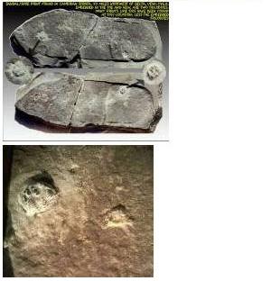 更惊人的发现在1968年,考古学家在美国犹他州的羚羊喷泉发现了与最古老的三叶虫化石同时留下来的人类脚印化石。难以置信的是,这是两处穿着鞋的人类脚印化石,一只三叶虫就静静地躺在脚印上面,人类学会做鞋也只有几千年,而曾经繁盛3亿年的三叶虫,早在2.4亿年前就绝迹了。