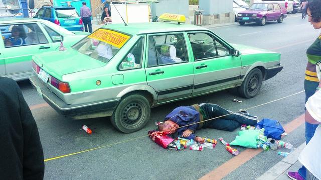 老人路上捡瓶子 被出租车从腹部轧过