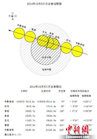 据介绍,北京时间10月8日下午5时14.4分,月亮将进入初亏(月球刚进地球影子);晚上6时24.6分为食既(月球刚刚全部进影子);晚上6时54.6分为食甚(月球进影子深处);晚上7时24.5分是生光(月球刚出地球影子);晚上8时34.7分是复原(月球刚刚全部出地球影子)。整个全食持续时间即月球完全进入地球本影持续时间是从食既到生光总共为一个小时。