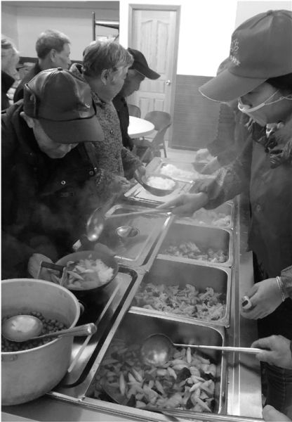 几位穿着红马甲的志愿者在餐厅门口引导人流,遇到行动不便的老人,志愿者们还会上前搀扶着先让老人坐好,然后打好饭菜送过来。