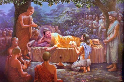 佛陀不久进入了拘尸那迦罗城,吩咐阿难道:“你去为我在娑罗双树间敷座设床,头在北面向西,我的教法最近可以北方宏传,未来也会盛行在西方。我于今夜,将入涅槃。”