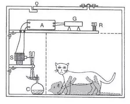 把一只猫放进一个封闭的盒子里,然后把这个盒子接到一个装置上,这个装置包含一个原子核和一个毒气设施。原子核有百分之五十的可能性发生衰变,衰变的时候就会发射出一个粒子来,这个粒子一发出来就会触发毒气设施,毒气一触发就会杀死这只猫,就是说猫也处于这种既死又活的迭加状态。这是他想象中的一个实验。