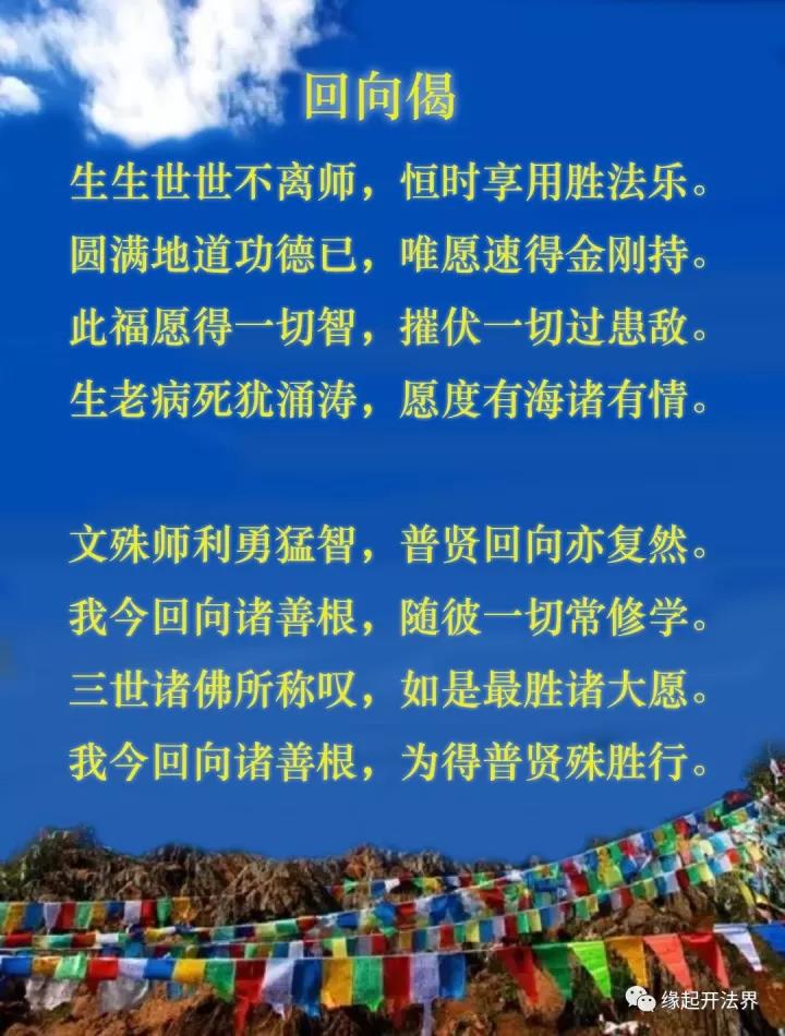 希望大家每次行善、念经之后必须做回向,回向的意思就是赠送——把所造的一切善业无条件的赠送给天下所有众生,愿以此善业令每个众生都能幸福解脱!吉祥圆满!