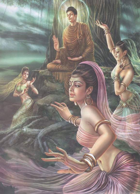 在释迦牟尼佛成道的时候,魔王种种的破坏,开始是魔军翻天覆地地冲、压过来,结果被释迦牟尼佛用慈悲心降伏了。后来又派三个魔女来恼害释迦牟尼佛,也是给佛降伏了。这时魔王难过得不得了,在地上打滚,不舒服,看到释迦牟尼成佛之后要度众生了,很多人要脱离他的范围要跑出去了。这个魔王正在焦急的时候呢,魔的妃子就对他说,哎呀,大王你不要着急啊,不要看这些;你要看以后释迦牟尼佛教下出家的那些人,他们烦恼是没有断的,你让他出家好了,出家之后,我们放长线钓大鱼,你让他跑,等到他养胖了,或者是他有点力量了,我们再把他勾回来。——那就是说用这些软的办法,等你真的有点成就了,他就想办法把你毁掉。