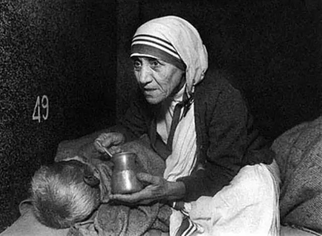 特蕾莎修女这样回忆她看到的悲惨世界:在加尔各答的街道旁有个濒死的妇人,老鼠和蛆正在咀嚼着她的身体,她坐在妇人身旁陪着她,直到她死去。