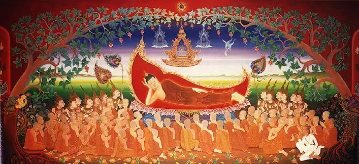 佛陀要求阿难尊者在双树间为他铺床,头朝北,面向西,双足交迭,保持正知正念侧卧。这时,娑罗树虽然不在开花的季节,却开起花来,花朵从树上掉落下来,纷纷落在佛陀身上。