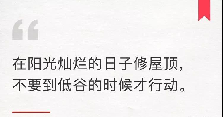 我不断提醒自己,要在阳光灿烂的日子修屋顶,不要等到下大雨去修屋顶。在阳光灿烂的时候去修屋顶,真的到大风大雨的时候先躲一躲再说很重要。