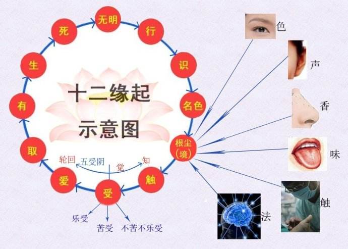 这个探讨源头的心理过程,用佛教常规的方式来表述,叫做“十二因缘”,十二因缘的十二个要素是:无明、行、识、名色、六处、触、受、爱、取、有、生、老死。