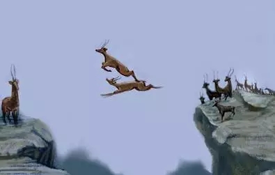 试跳成功!紧接着,一对一对班羚凌空跃起,山涧上空划出一道道令人眼花撩乱的弧线,一只只老年班羚全摔得粉身碎骨。