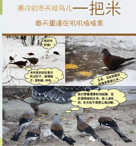 微社区分享:冬季食物匮乏,洒些米粮供给鸟儿们