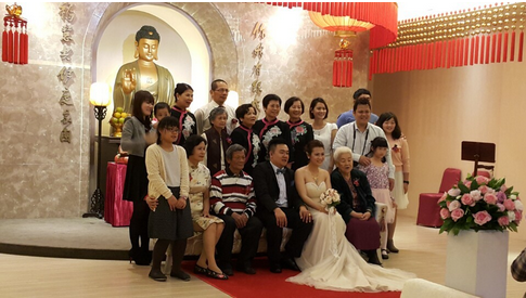 佛陀证婚庄严殊胜,终于明白大般若蜜经里的甚可爱,原来呀!生活中处处可发觉可爱喜悦,刚开始真的不明白,此时此刻甚感动,真的多么可爱呀!我们十二知宾义工何等荣幸,能参与这么殊胜佛婚,为何我在司仪开始宣导时,喜悦的泪水湿润眼框,原来呀!此时此刻与佛陀是这样的亲近,佛陀慈晖布满整个喜堂,全场鼓掌祝福,佛陀呀!真的要赞美您,此刻的心中除了祝福璧人美满幸福,白首偕老,也祝福这对璧人及大家顺心吉祥如意,也祈愿将来佛陀也为我的儿子证婚...感恩与祝福...